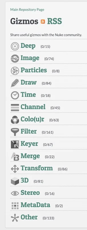 The tool menu’s categorisation is laid out in a bit of a mix between Nuke’s original toolbar organisation, and Nukepedia’s gizmo categories. This should be helpful and intuitive when browsing for certain types of tools, or to quickly find the tool you are looking for if you forget the name. Some of these menus have sub-menus such as Filter/Glows/ for further groupings to reduce the overall list size of each menu.